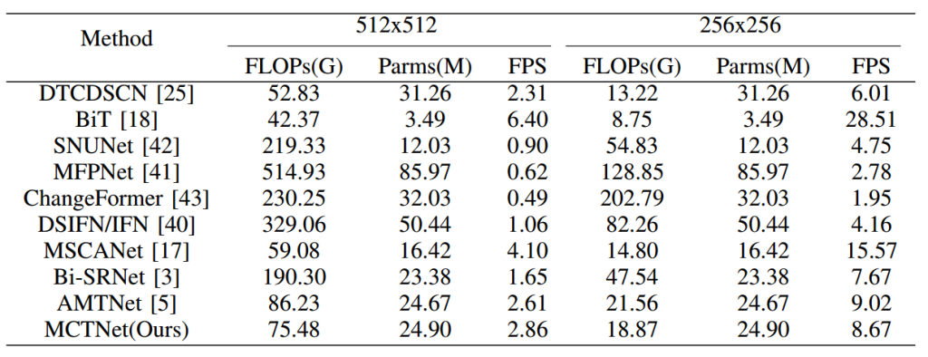 本文将所提方法与近期最先进的变化检测算法进行了比较,包括基于 CNN 和基于 Transformer 的方法。纯基于 CNN 的对比算法包括 DTCDSCN [25]、DSIFN/IFN [40]、MFPNet [41] 和 SNUNet [42];基于 Transformer 的对比算法包括 BIT [18]、MSCANet [17]、Bi-SRNet [3]、ChangeFormer [43] 和 AMTNet [5]。其中,DTCDSCN 和 Bi-SRNet 是多任务网络,其他为单任务网络。所有对比算法均有公开实现。