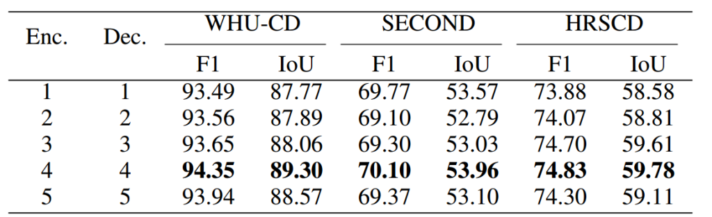 为评估从骨干网络提取的特征尺度数量的影响,本文从四个不同尺度的残差块中提取多尺度特征图(Res4 和 Res5 输出特征尺度相同,对于 Res4 的输出特征,在多尺度特征融合阶段将其整合到从其他残差块提取的特征中)。如表 18 和表 19 所示,当利用从残差块 Res2、Res3 和 Res5 提取的三个特征尺度时,模型性能达到峰值。若尺度数量过少,模型可能难以充分表示不同粒度级别的特征,从而可能影响其检测遥感影像中细微变化的能力;而从 Res4 提取特征并将其与其他残差模块的输出特征融合,不仅未提升模型性能,反而导致性能下降。使用所有四个残差模块提取的特征图时性能下降,可能归因于以下因素:首先,额外的特征图可能引入冗余或噪声,削弱有效变化检测所需的判别信息;其次,这些特征图的整合过程可能并非最优,导致不同尺度间产生干扰或信号冲突。