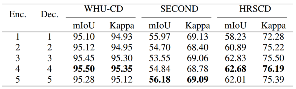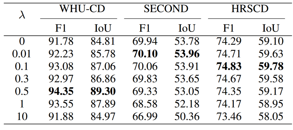表 13 展示了不同 λ 值下二值变化检测的性能,突出了语义分割对二值变化检测结果的重要影响。在 WHU-CD 数据集上,当 λ 设为 0.5 时,模型在二值变化检测任务上取得最佳性能,表明为该数据集分配适度的分割损失权重是最优的;在类别不平衡且语义类别更多的更具挑战性的 SECOND 和 HRSCD 数据集上,当 λ 取较小值(0.01 或 0.1)时,模型表现最佳。与 WHU-CD 相比,SECOND 数据集上的语义分割预测可靠性较低。因此,表 13 的结果还表明,在多任务框架中,如果语义分割任务的性能不佳,其增强二值变化检测任务性能的能力将受到影响。