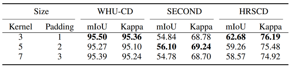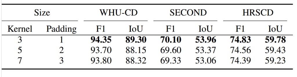 表 11 时空特征学习模块中卷积核大小对二值变化检测的影响(%)