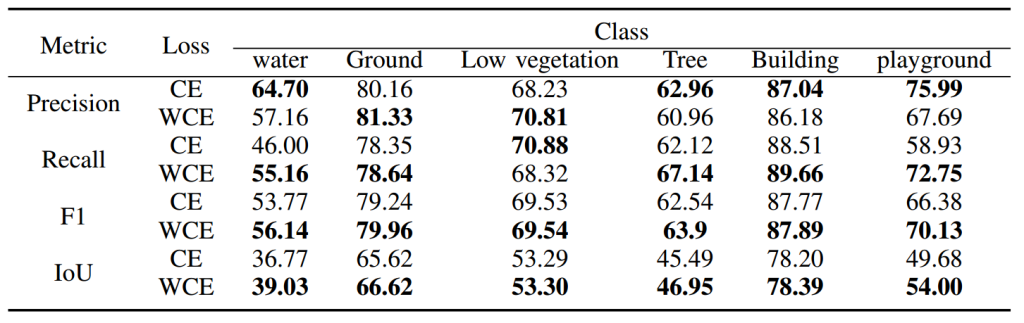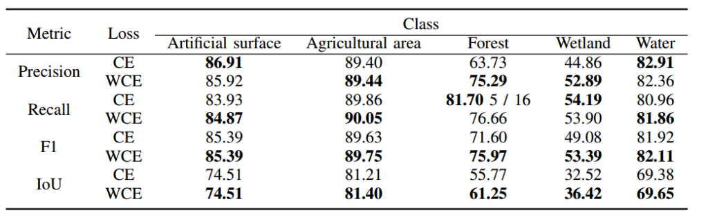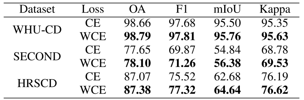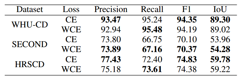 本文进行了对比研究,评估不同损失函数的影响。具体来说,通过整合从训练数据中计算的类别比例先验,将语义分割任务的标准交叉熵损失替换为加权交叉熵(WCE)[45,46]。加权交叉熵损失允许模型为稀有类别分配更高的重要性,从而提高其准确分类语义变化的能力。