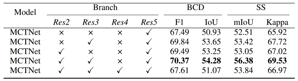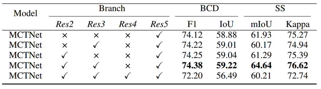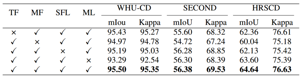 为评估 MCTNet 中四个关键组件(Transformer 模块、多尺度特征融合、时空特征学习模块和多任务学习)的影响,本文进行了消融实验。语义分割任务在 WHU-CD 数据集上使用交叉熵损失,在 SECOND 和 HRSCD 数据集上使用加权交叉熵损失。